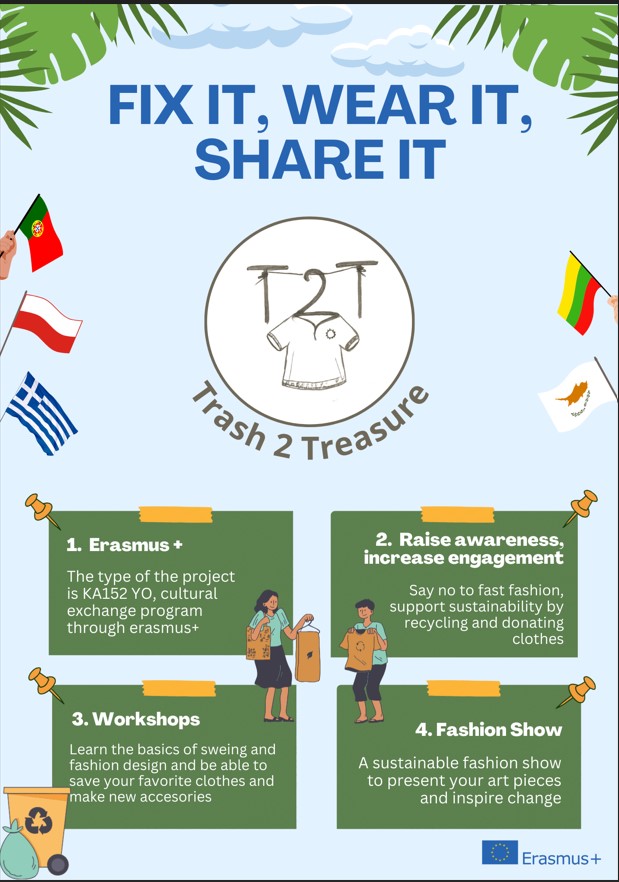 Trash 2 Treasure project is an Erasmus+ KA152 project created during the training course "SUCOMINNO", taking place in Poland from January 2–9, 2025. The name (Trash 2 Treasure) of the Youth Exchange refers to the main idea of the project: raising awareness about waste management and recycling of used clothes. The Youth Exchange will be organized by a partnership of five municipalities from Poland (Starachowice), Portugal (Valongo), Cyprus (Polychoros), Lithuania (Ukmerge), and Greece (Korydallos).